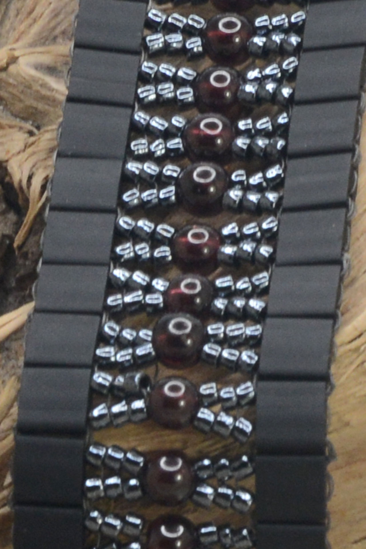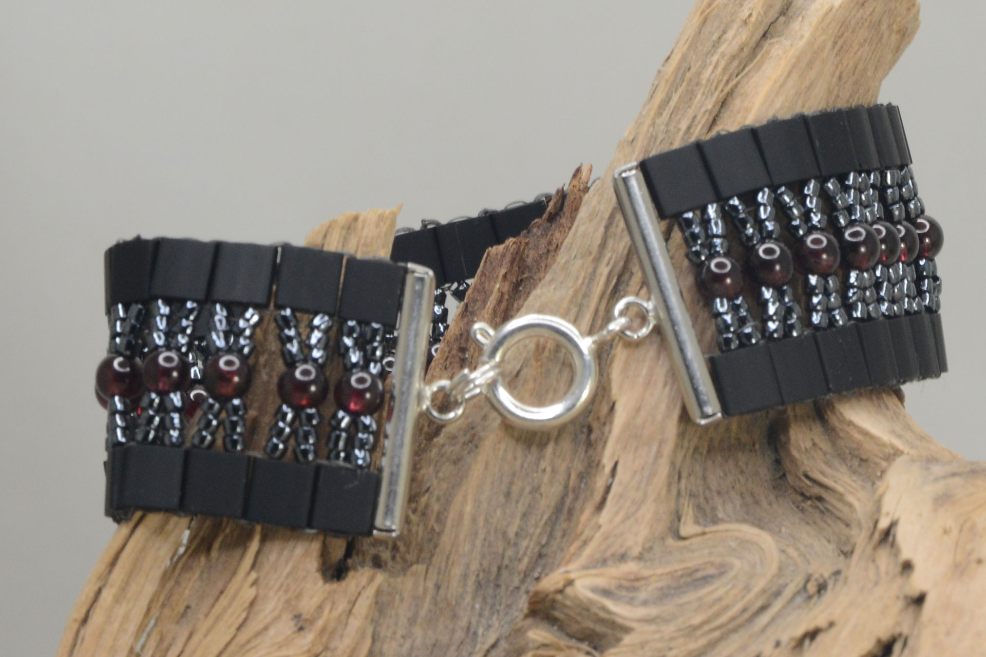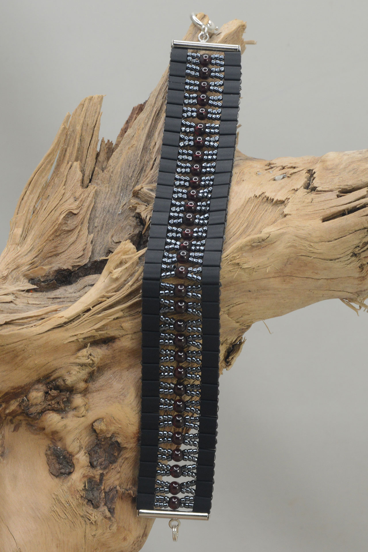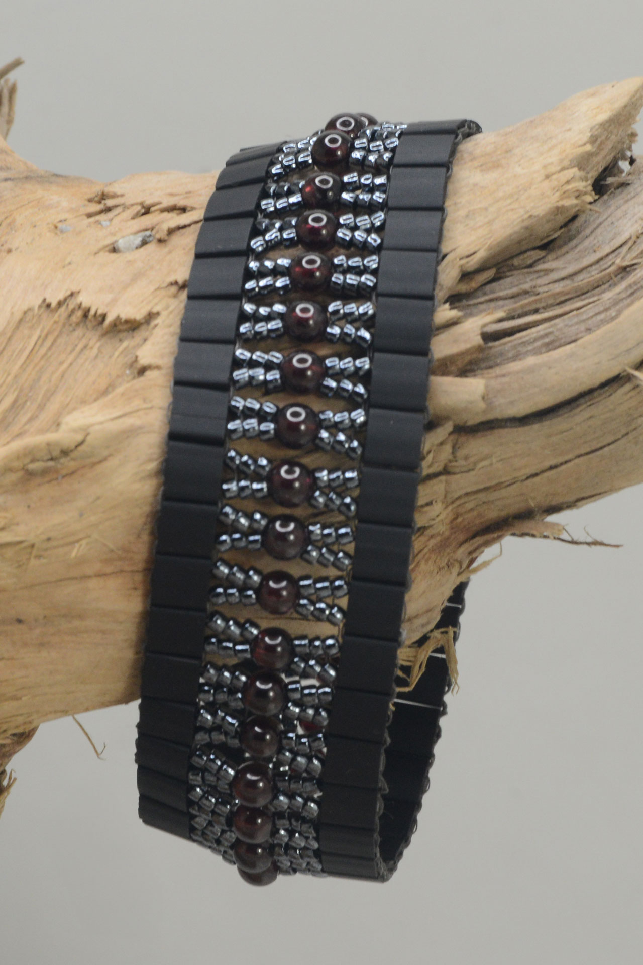 Dieses handgefertigte Armband ist mit japanischen Glas- und Granatperlen gefädelt.