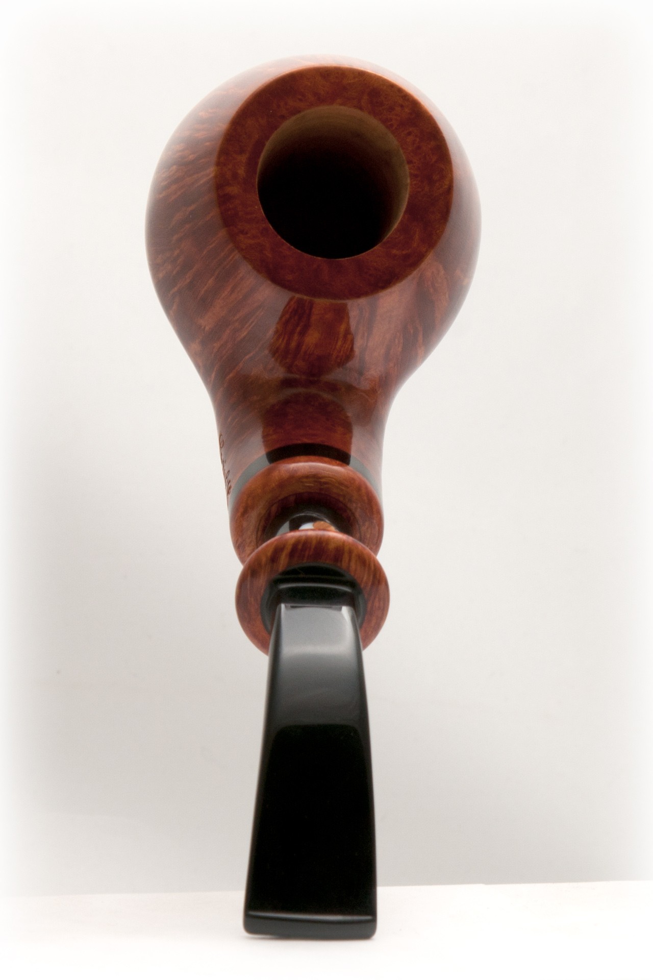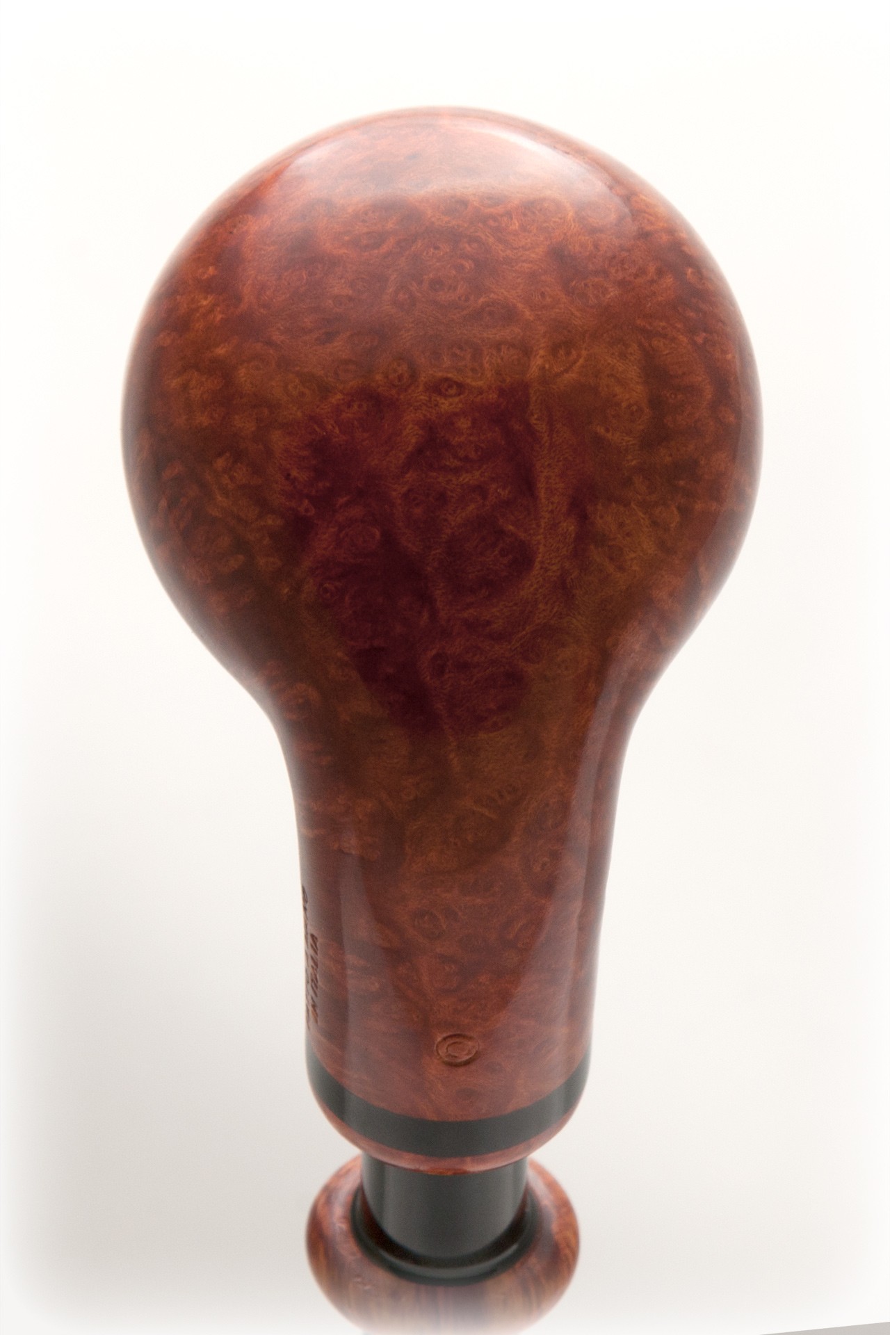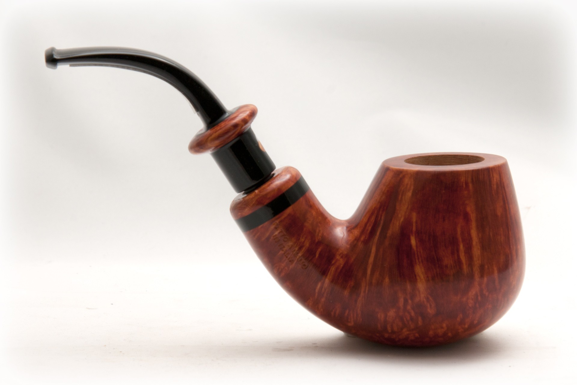 Eine gebogene Bruyèreholz-Pfeife, handgemacht von Claudio Cavicchi aus Italien, mit Holzring am Mundstück und Acryl- und Holzring am Holm.