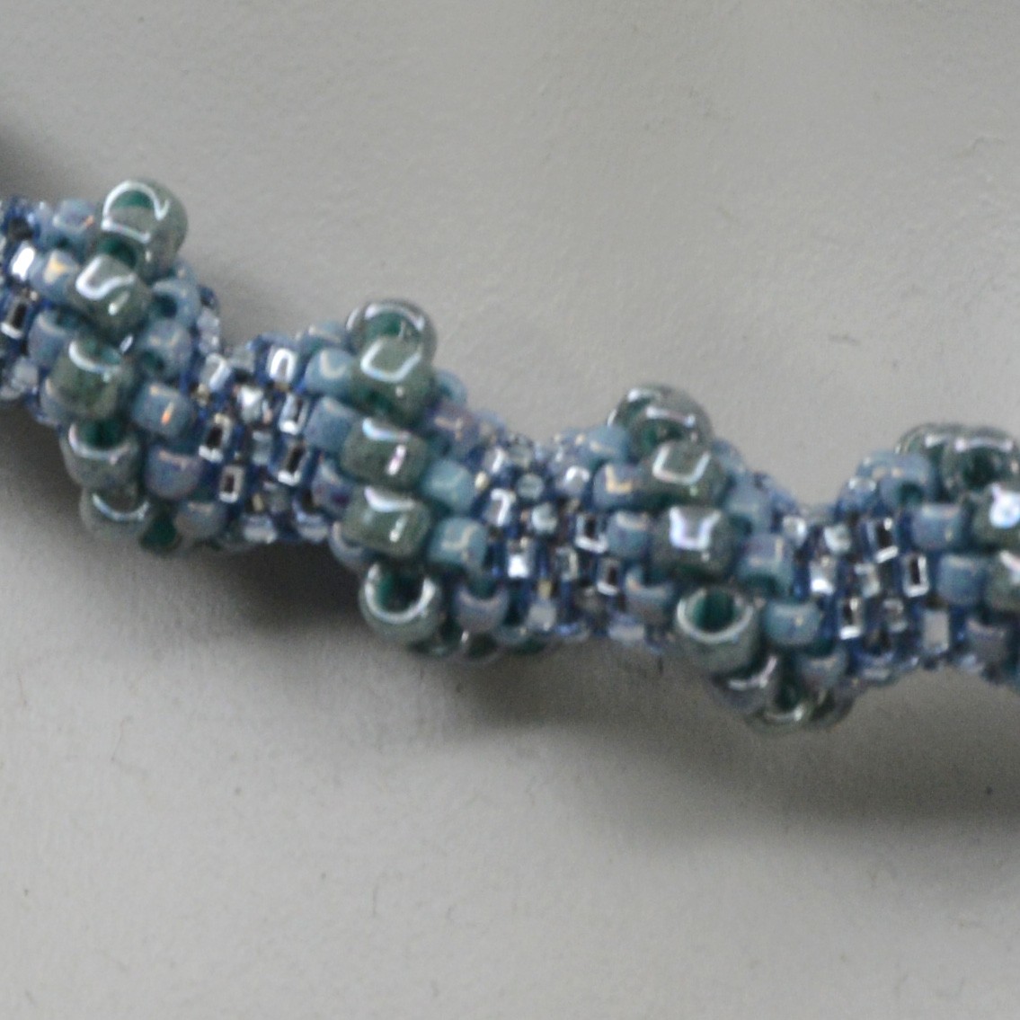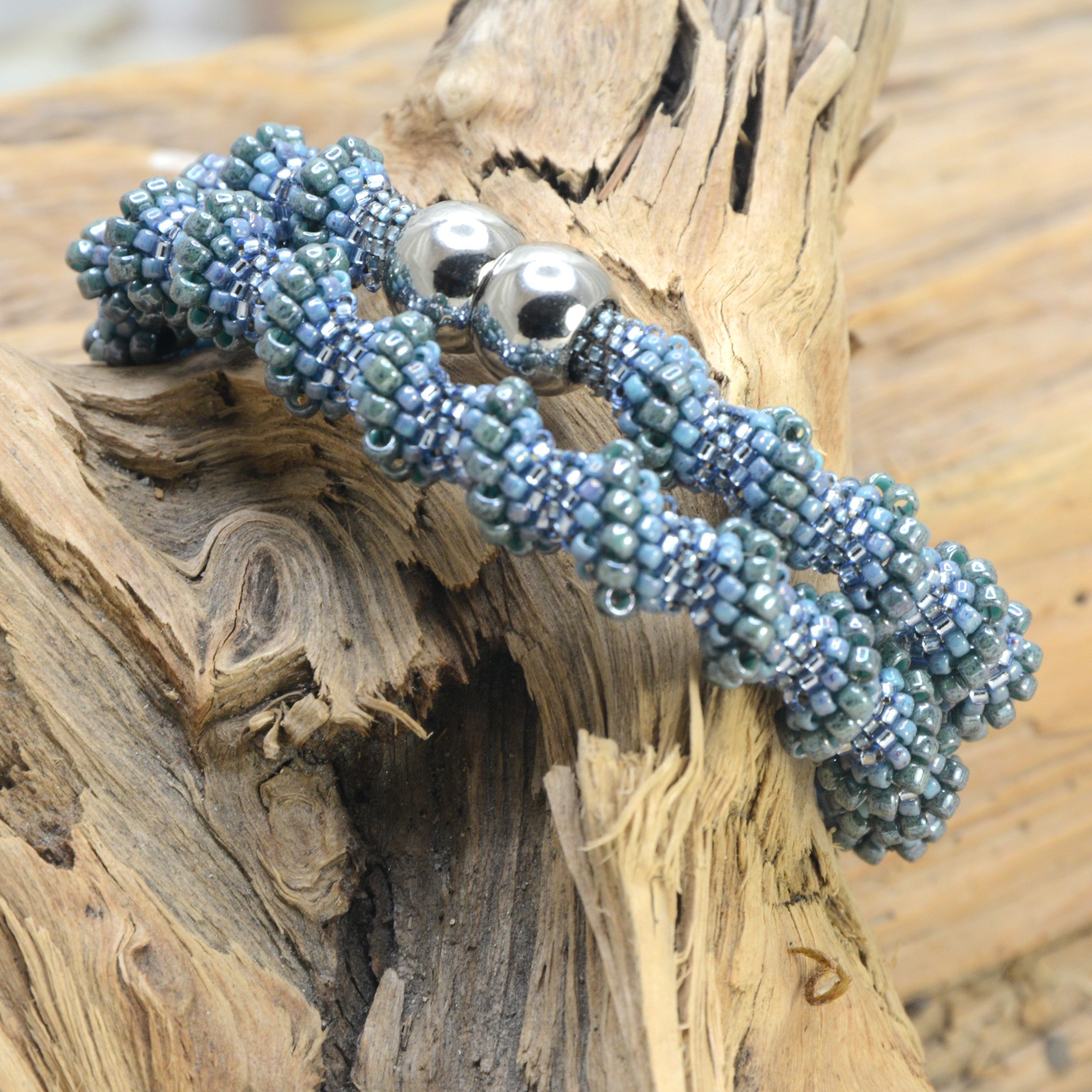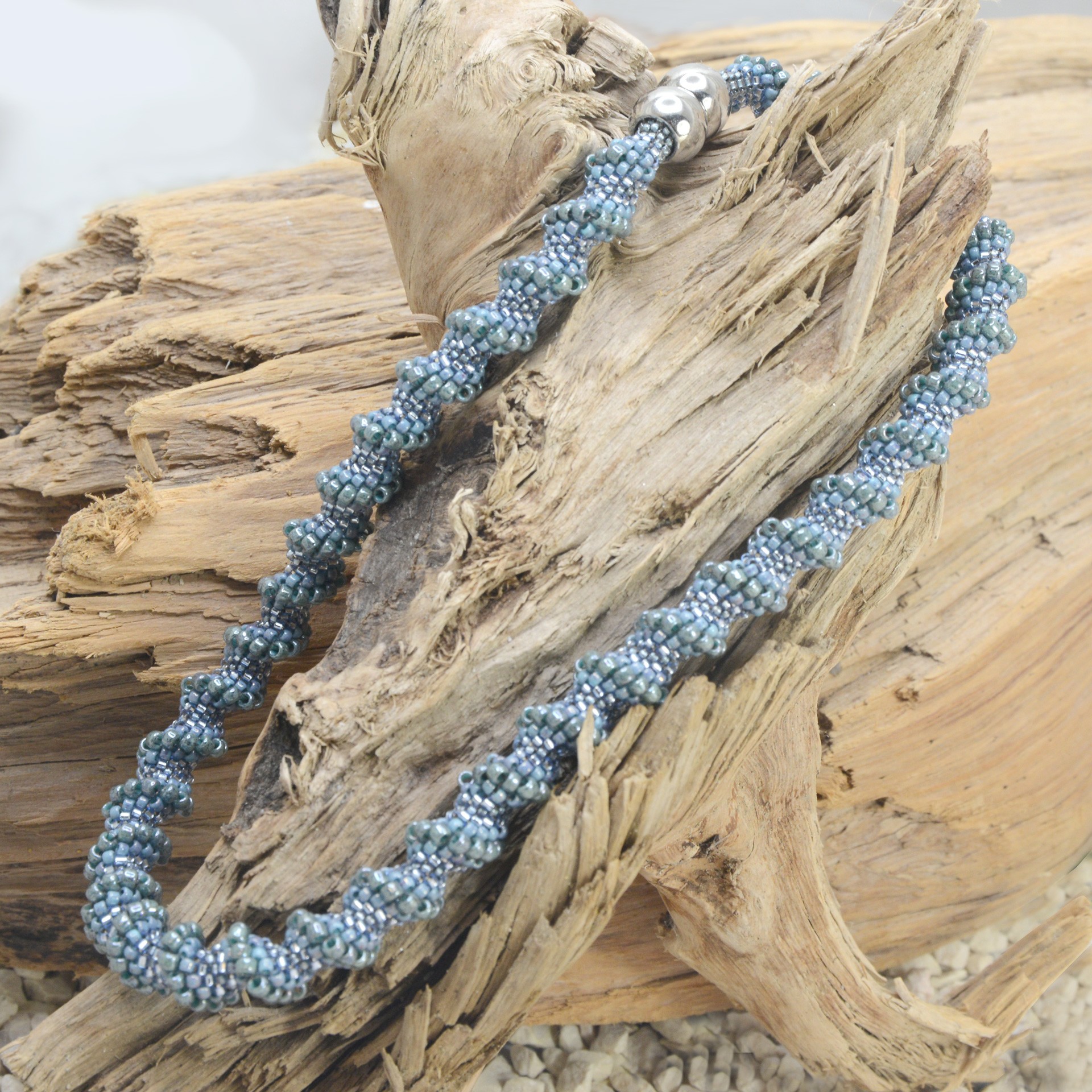 Diese handgefertige Kette ist mit japanischen Glasperlen gefädelt und hat mit einem schlichten silberfarbenen Magnetverschluss.
