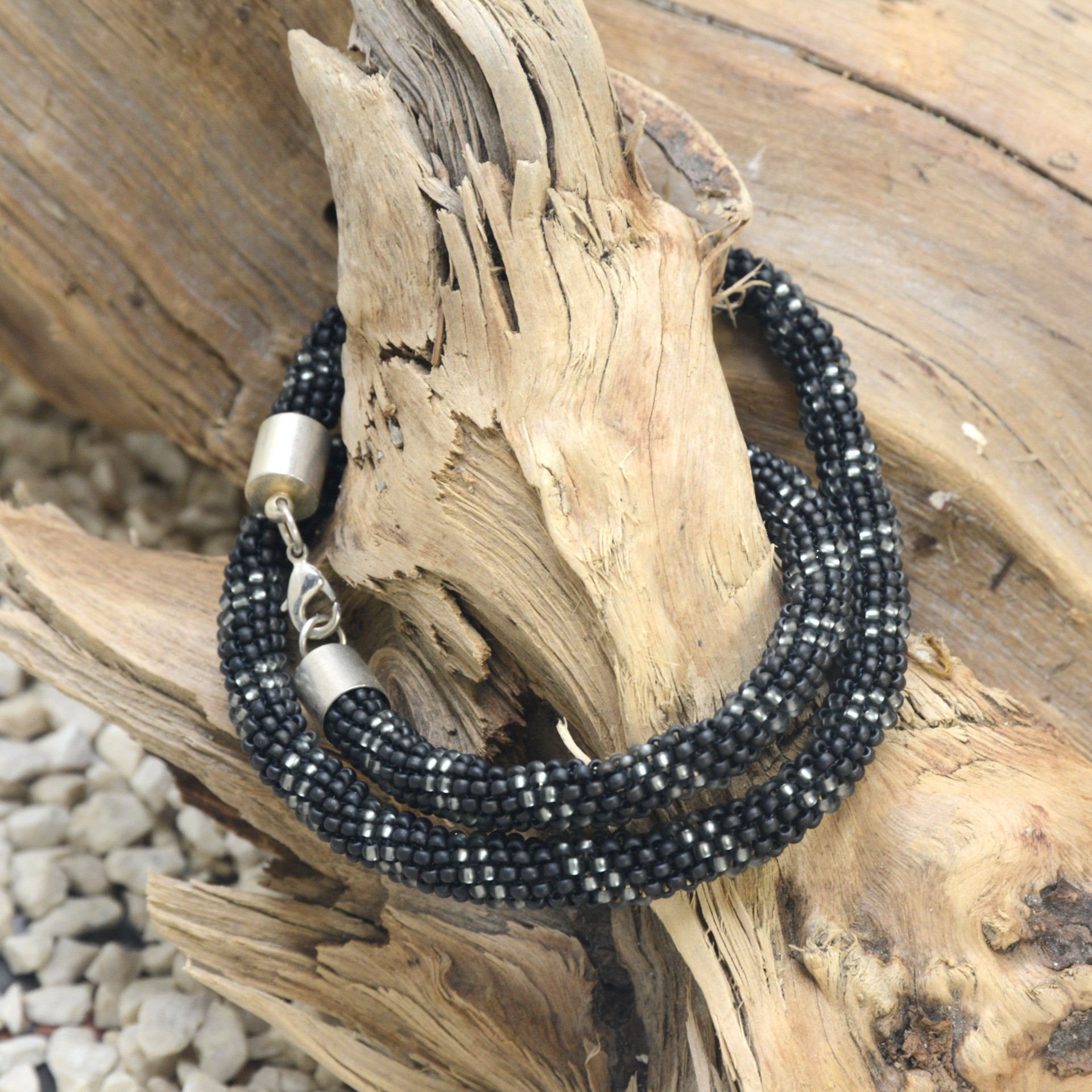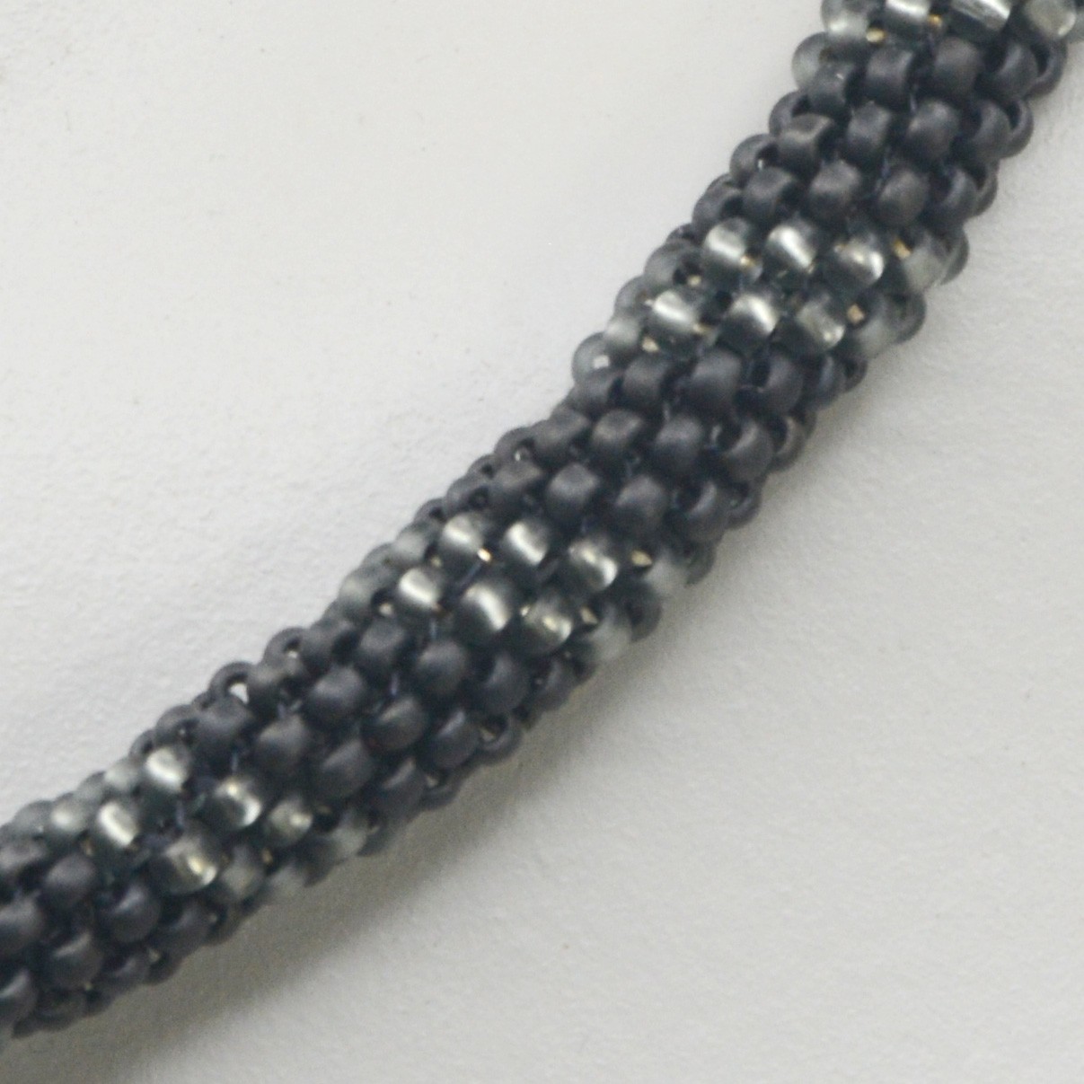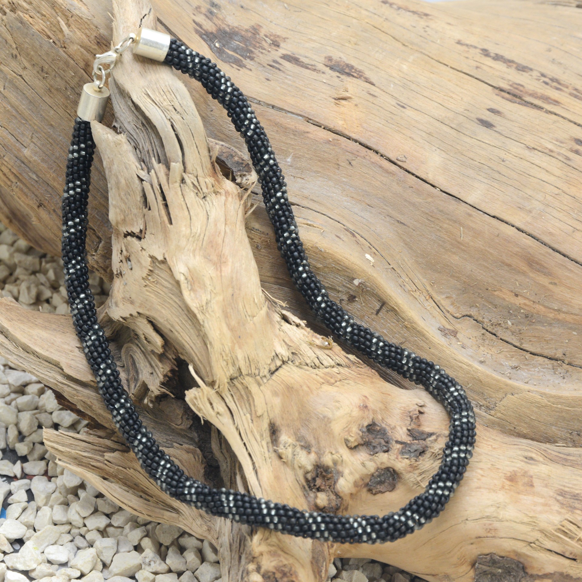 Diese handgefertige Kette ist mit japanischen Glasperlen gefädelt und hat mit einem schlichten silberfarbenen Karabinerverschluss.