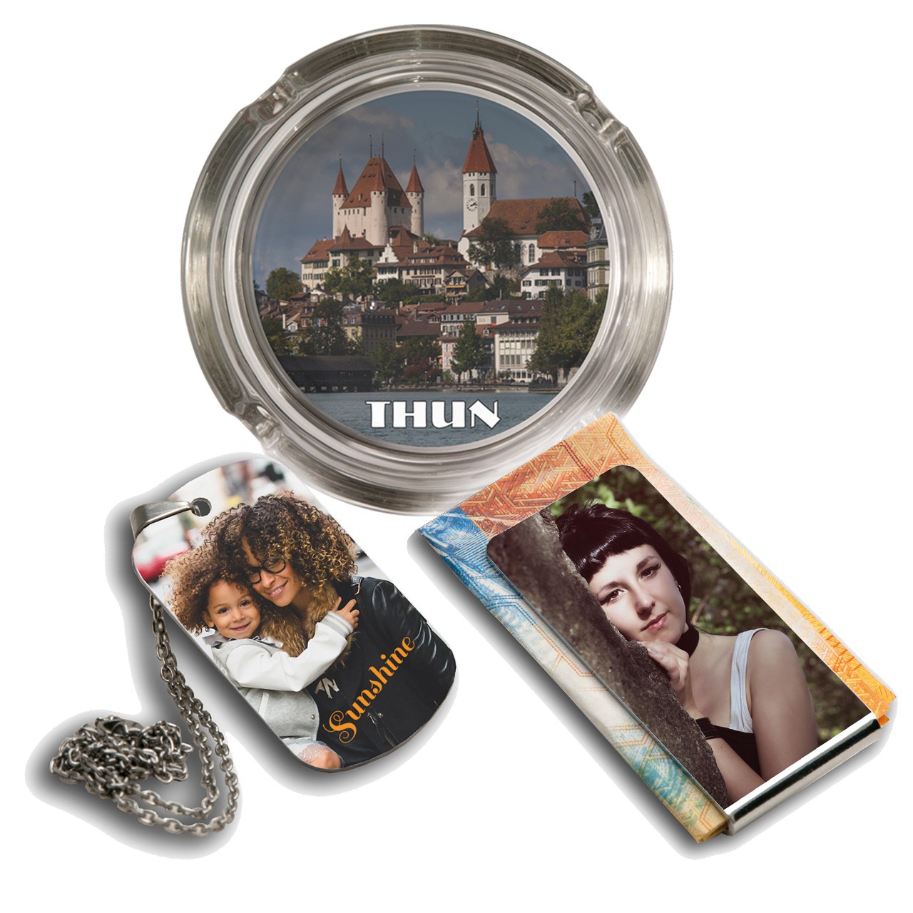 Kreieren Sie für sich oder Ihren Liebsten ein persönliches Geschenk. Mit unserem Designer können Sie mit ihren eigenen Bildern oder mit den von uns zur Verfügung gestellten Motiven ihre eigenen Aschenbecher, Anhänger, Magnete oder Geldklammern gestalten.