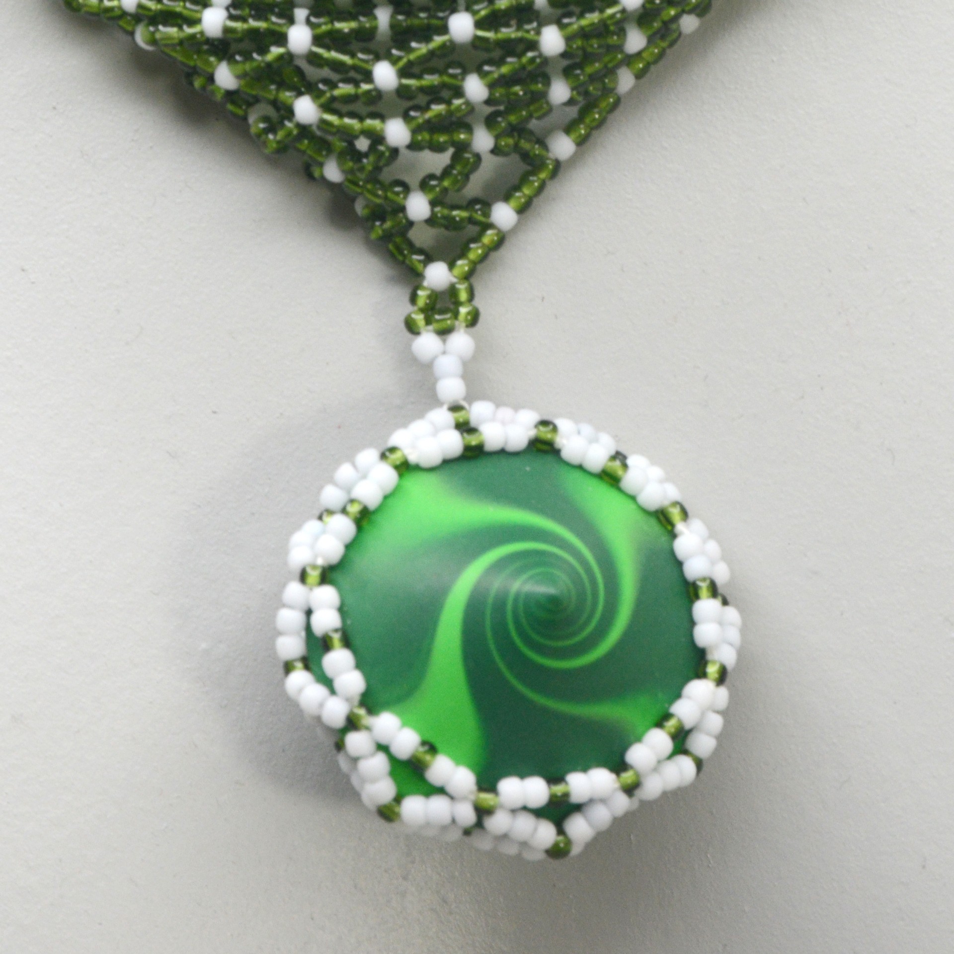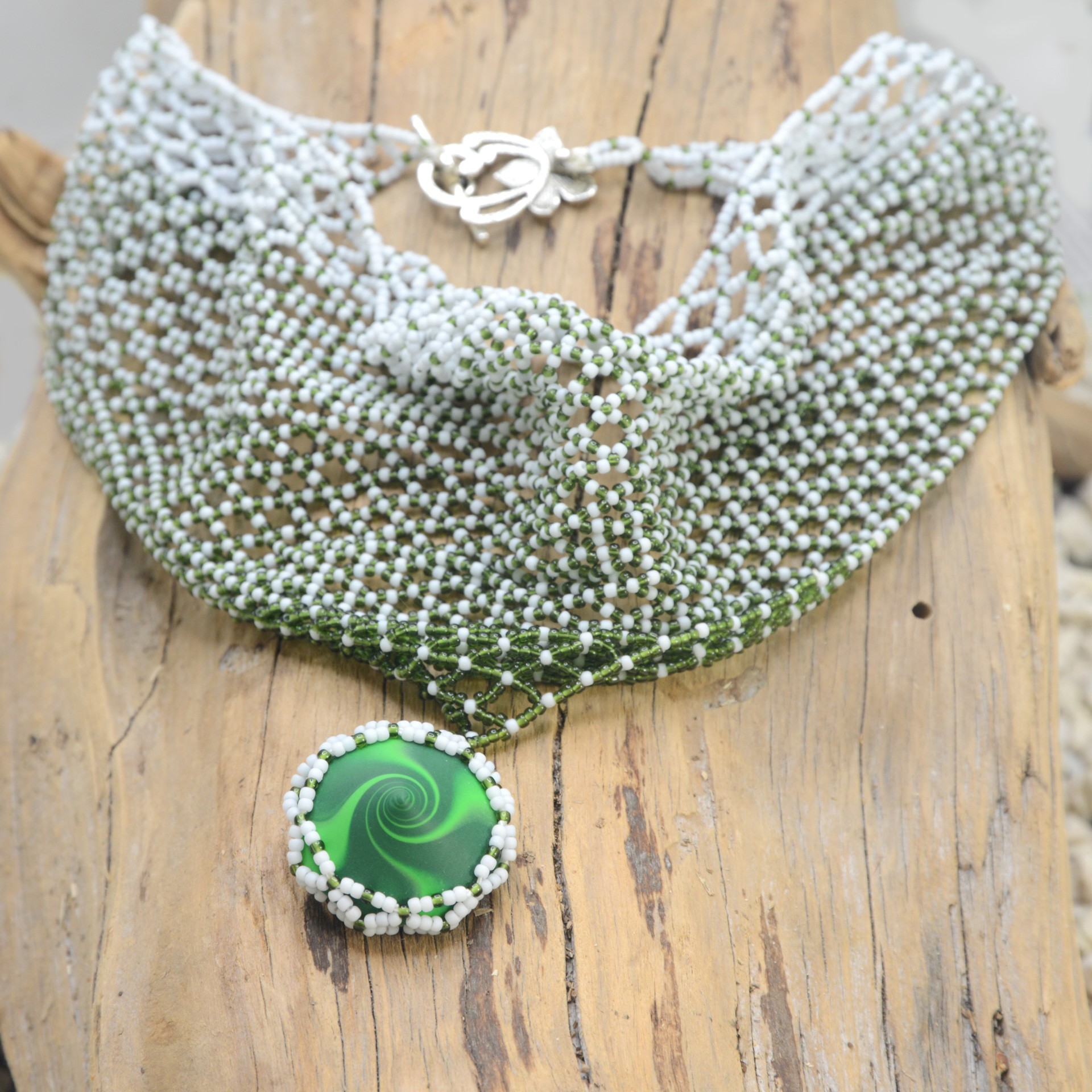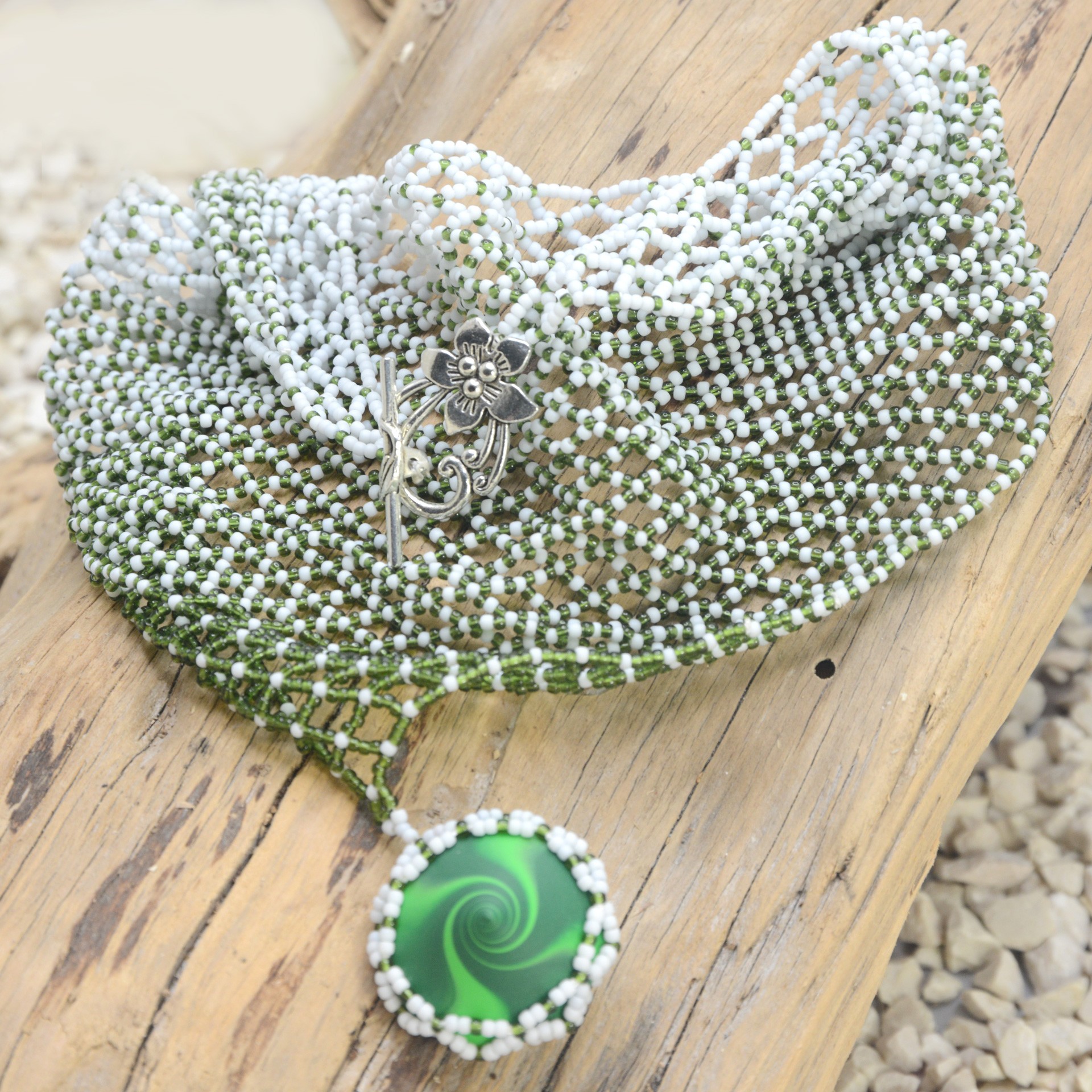 Diese handgefertige Kette ist mit japanischen Glasperlen gefädelt und hat einem floralen silberfarbenen Ring und Stab Verschluss. Anhänger in Perlen eingefasster Fimo Swirl.