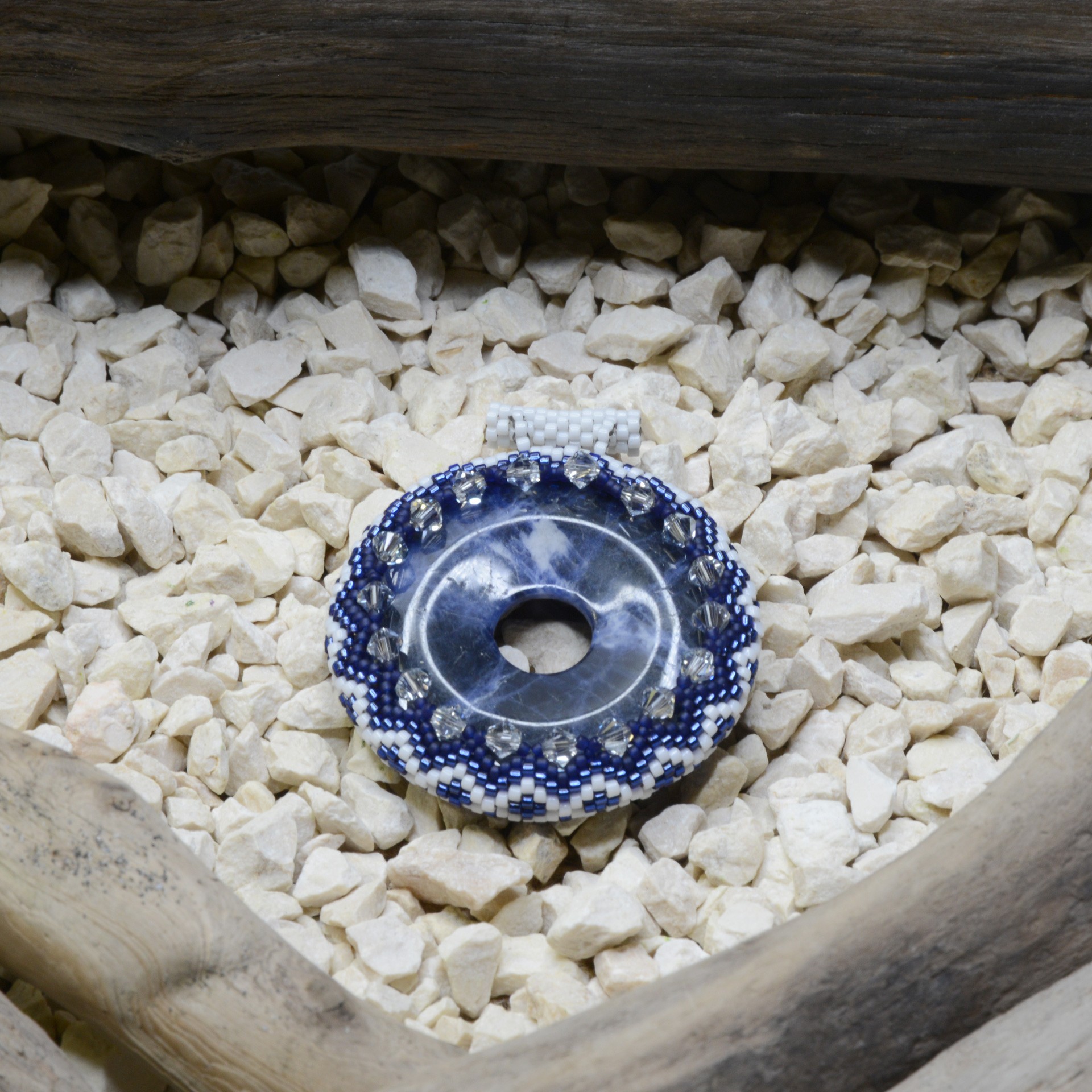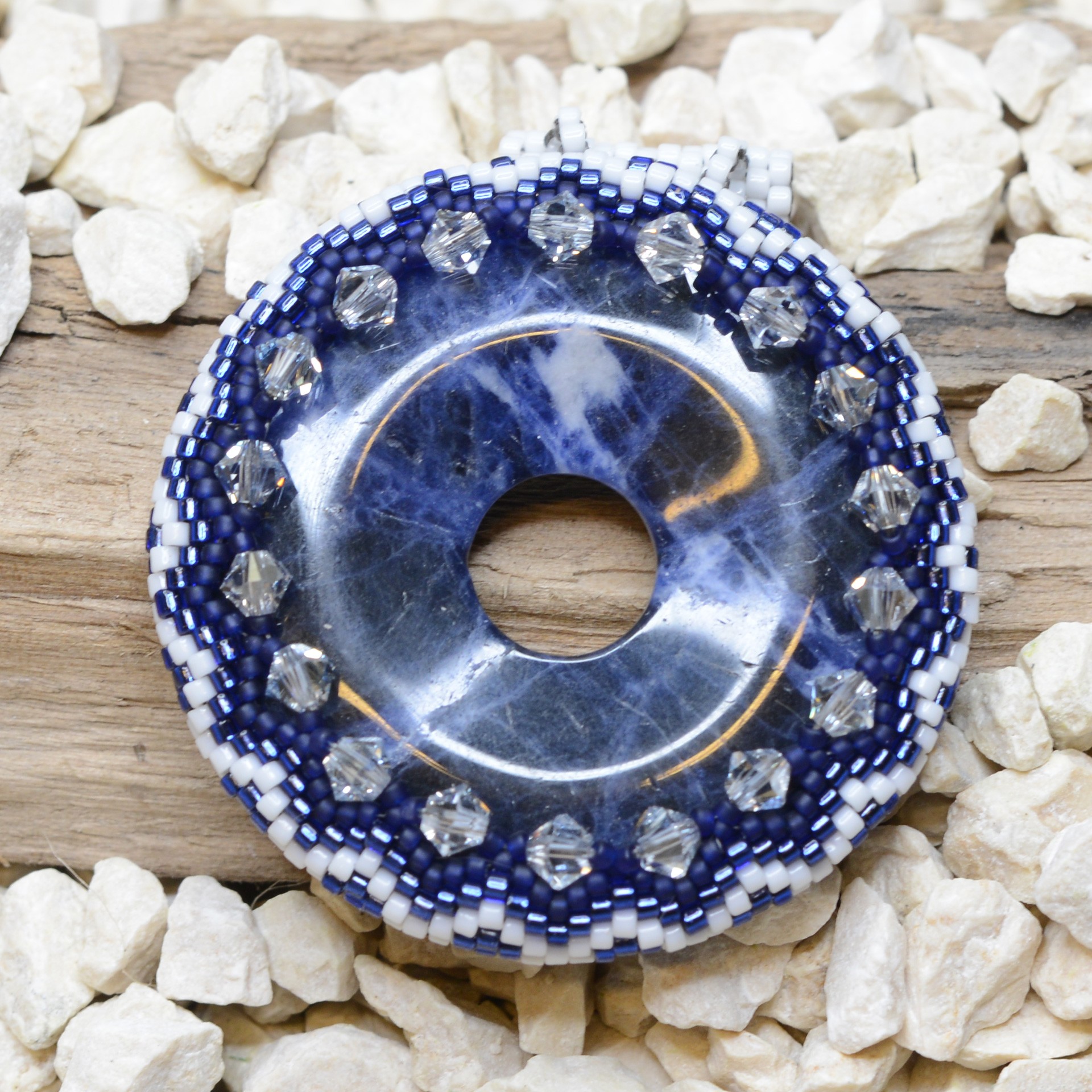 Dieser hangefertige Anhänger ist ein mit japanischen Glasperlen und Swarovsy Crystal eingefasster Sodalith Donut.