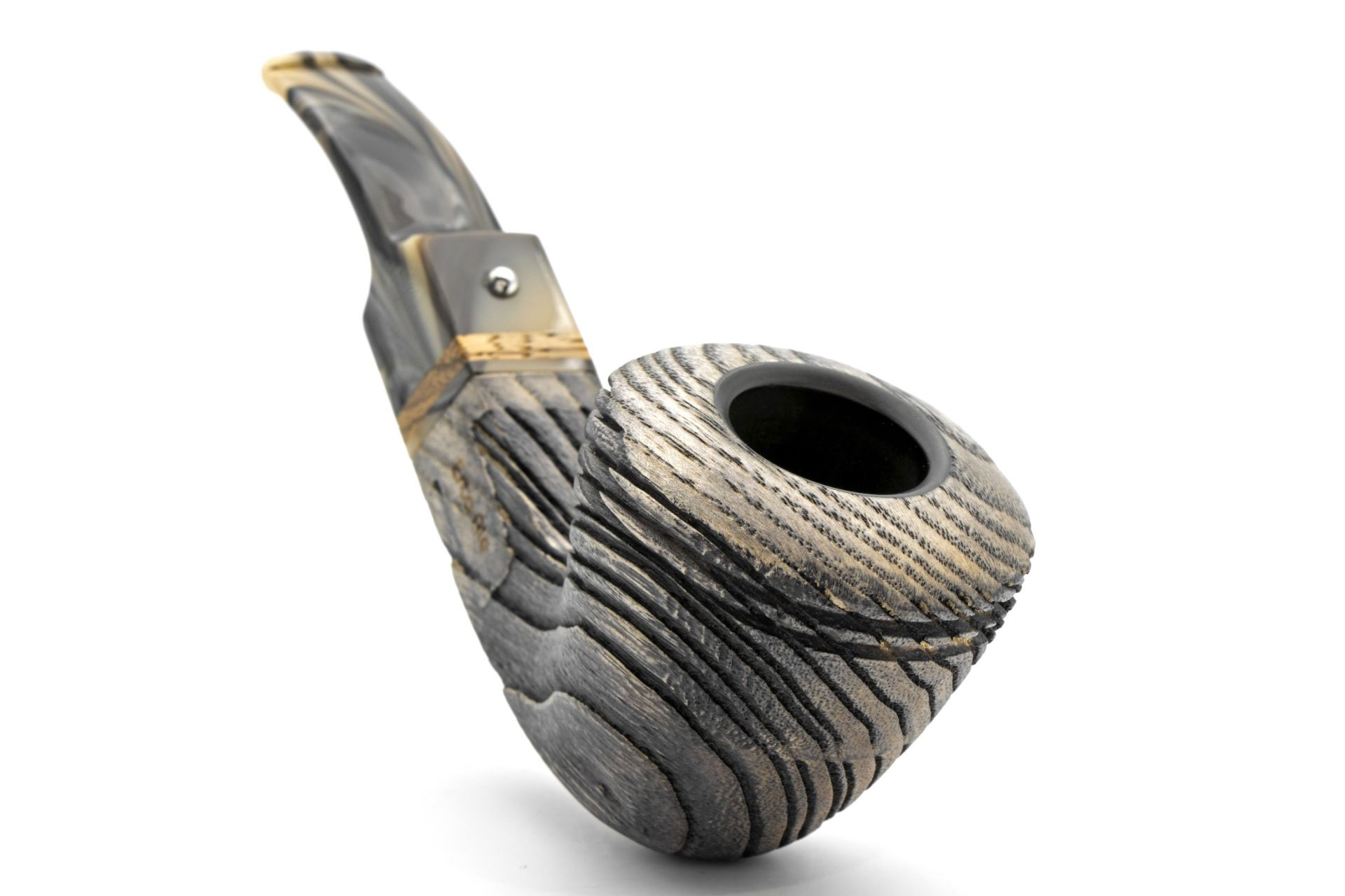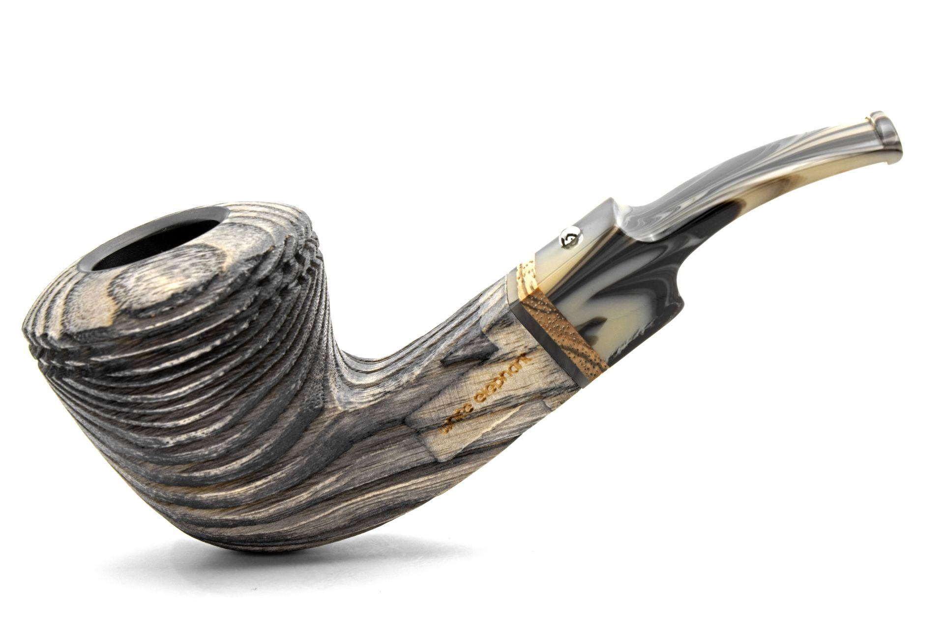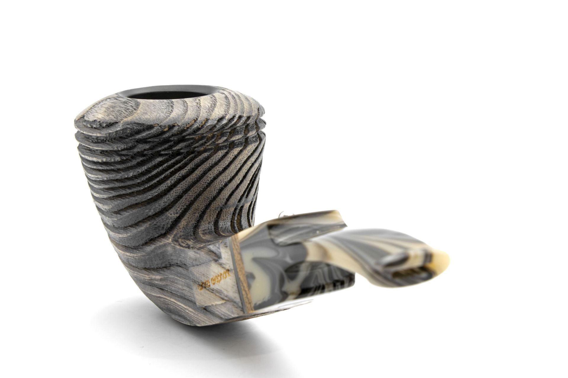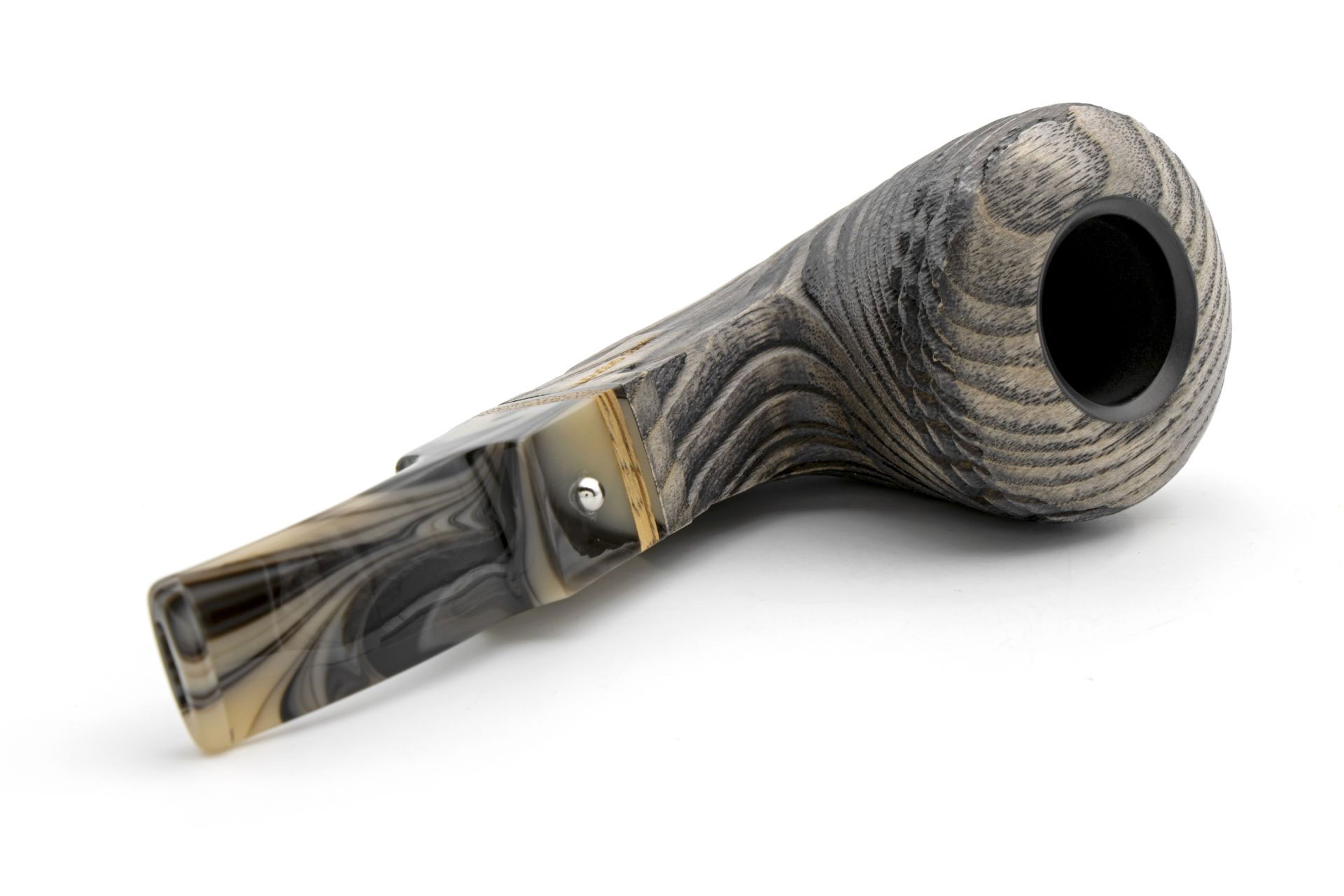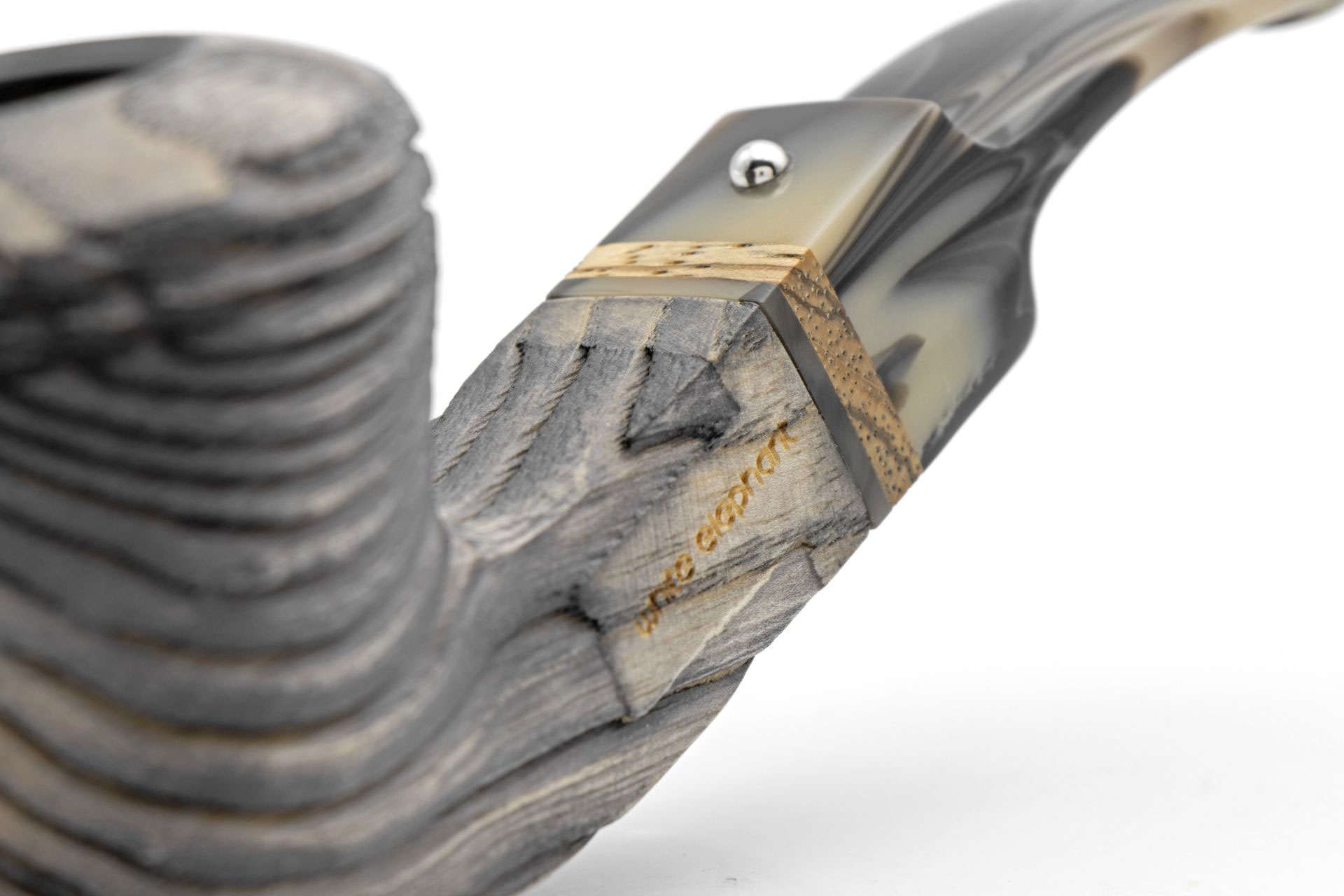 Als Namensgeber für die neue White Elephant Serie dient der Erta Ale Vulkan in Äthiopien. In dessen Mitte befindet sich ein aktiver Lavasee, das Gebiet rund um den halbwachen Riesen ist grau und felsig und ähnelt damit einer Mondlandschaft. Die Erta Ale Modelle sind groß und dennoch kompakt. Der Kopf besteht aus südamerikanischer Esche, die nach einer intensiven Sandstrahlung eine tiefe und beeindruckende Struktur liefert. Das Holz ist aschgrau gebeizt. Das Mundstück haben ist farblich auf den Pfeifenkopf abgestimmt. Die heiße Acrylmasse wird hierbei nur leicht verrührt. Im Mundstück ist ein echter Zebranoring eingelassen, der die wilde Naturoptik unterstreicht. Im Kopf befindet sich ein Einsatz aus Graphit, der aus gepresstem Kohlenstoff gewonnen wird.